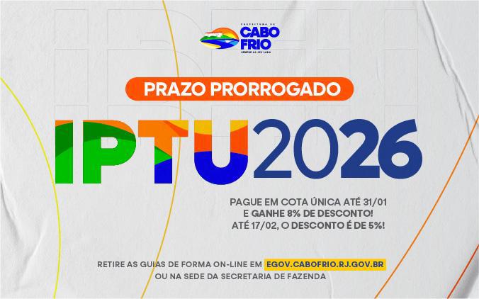 Jovem TV, 30 de janeiro de 2026IPTU 2026: contribuintes de Cabo Frio podem pagar com desconto de 8% até sábado (31)